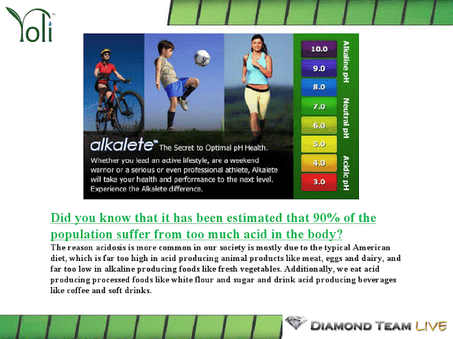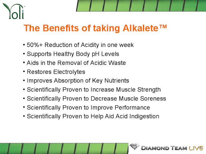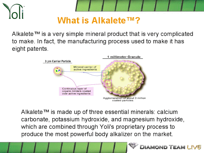 Alkalizing the body makes it easier for you to maintain proper PH Balance and Health. This allows your system to focus it's energy on maintaining good health. Yoli has found a simple and easy to use solution for proper PH Health. Alkalete is now available in capsule and liquid form with a patented blend of electrolytes that have an alkalizing effect on your body.